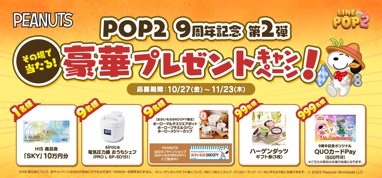 コラボ期間中、豪華リアルグッズが当たるキャンペーンを開催します。「LINE POP2」のステージ内に出現する「9ブロック」を“99個”消す、ハートメッセージを送信する等の条件をクリアしてもらえる応募券を使って、ゲーム内のイベント一覧より応募できます。奮ってご参加ください。