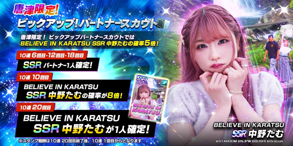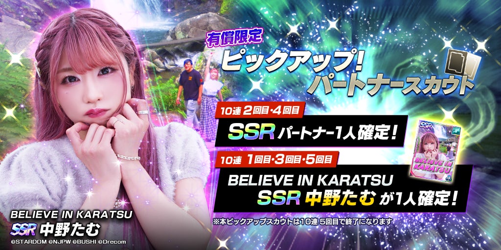 新日SSは2023年10月31日(火)9:00から、新日SSと佐賀県唐津市のコラボレーション企画として、SSR「[BELIEVE IN KARATSU]中野たむ」が登場する「唐津限定!ピックアップ!パートナースカウト」を開催。本スカウトは、10連スカウトを既定回数行うと、ラインナップに含まれるSSRパートナーからいずれか1人を確定で獲得できる仕様となる。また、今回初登場するSSR「[BELIEVE IN KARATSU]中野たむ」は、ピックアップ対象として、スカウトのプレイ回数に関わらずスカウト確率が通常の5倍となっている。