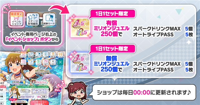 イベント専用ページの「イベントショップ」ボタンから、「スパークドリンクMAX」5個と「オートライブPASS」5枚セットを1日1回限定で利用できる。ショップは毎日00:00に更新される。
