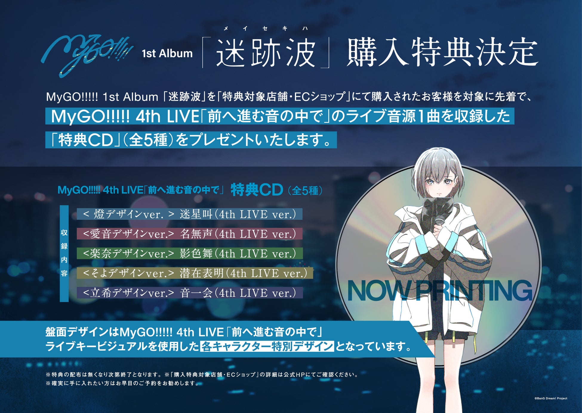 MyGO!!!!! 1st Album「迷跡波」(Blu-ray付生産限定盤・通常盤を問わず)を「特典対象店舗・ECショップ」にて購入されたお客様を対象に先着で、「特典CD」(全5種)をプレゼントいたします。