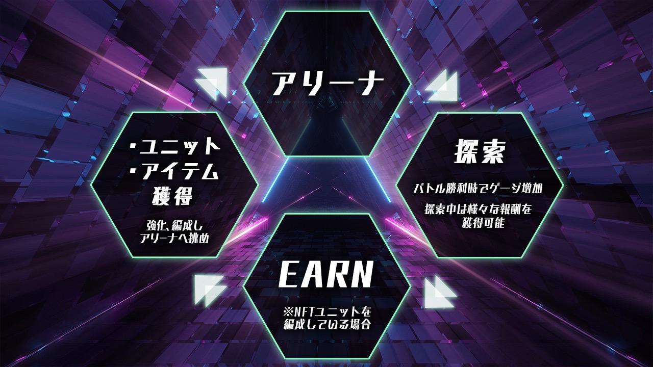 ホーム画面で、探索ゲージ(時間経過で消費される仕様)が残っている場合は、チーム編成されたユニットが自動で探索を行い、様々な報酬を獲得することができる。報酬内容及び獲得効率はアリーナランク毎に決まる。NFTユニットを保持していれば、ユーティリティートークンと交換可能なアイテムも獲得可能。また、NFTユニットの所持数によって、探索ゲージの上限値が変動する。