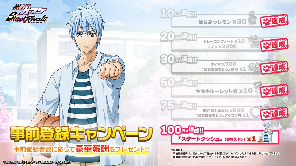 事前登録者数が75万人を突破したため、正式サービス開始時に「はちみつレモン×30」、「トレーニングノート×10」、「コイン×3000」、「ダイヤ×300」、「始業おめでとう称号×1」、「キセキルーレット券×10」、「潜在能力の欠片×500」、「始業おめでとうアイコン枠×1」をプレゼントすることが確定した。