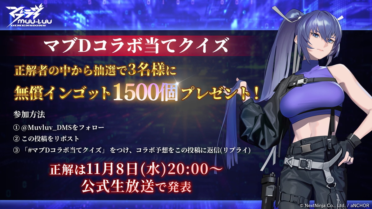 NextNinjaとaNCHORは、マブラヴシリーズのスマートフォン向けアクションRPG『マブラヴ:ディメンションズ』の初となるコラボイベントの開催を決定し、詳細を11月8日20時からの「公式生放送第9回~初コラボ発表回~」で発表する。