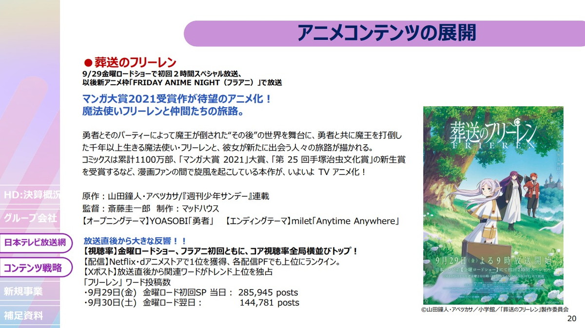 日本テレビHD、9月中間期のアニメ事業は海外セールス好調で収入83%増の34億円、収支65%増の15億円…『葬送のフリーレン』も視聴率トップと好調な滑り出し