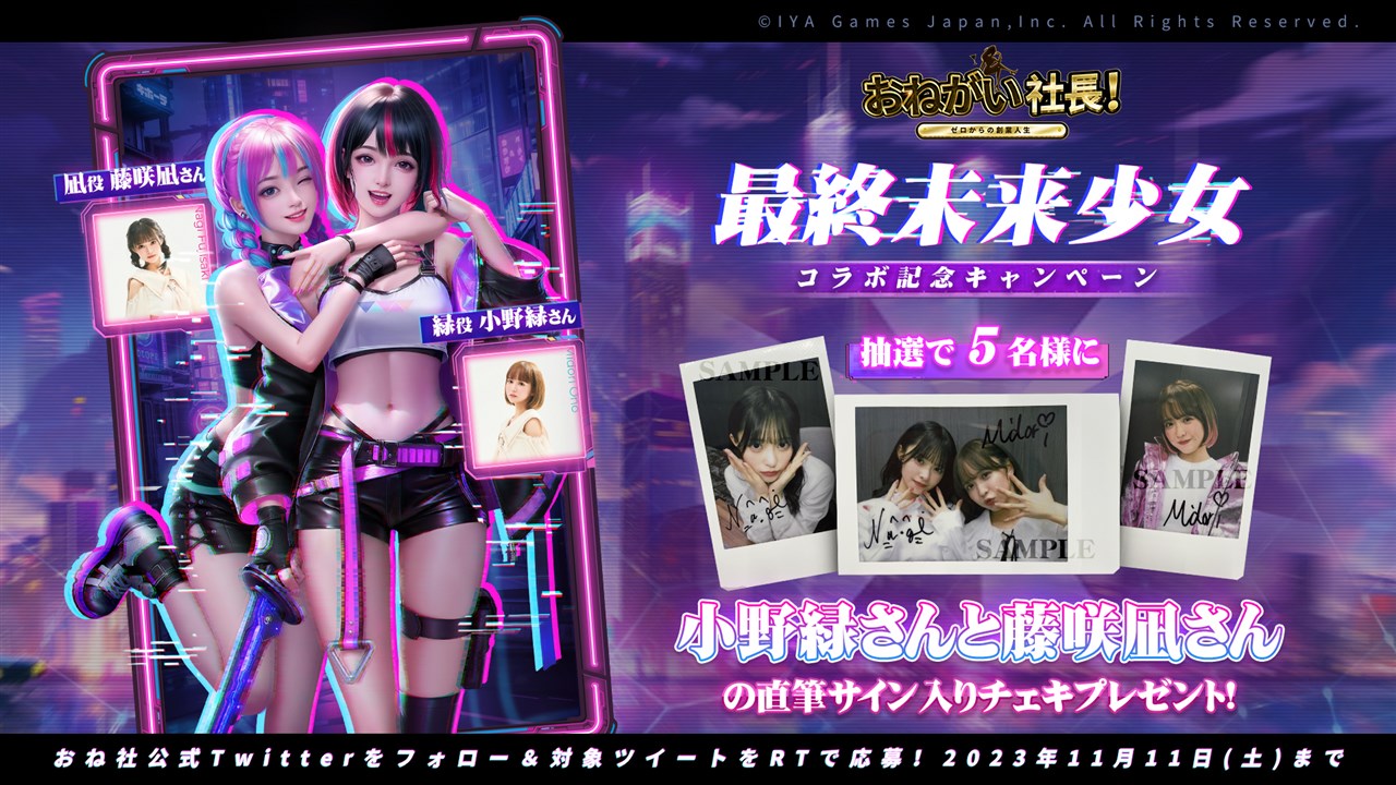 『おねがい社長!』と「最終未来少女」のコラボ記念として、藤咲凪さんと小野緑さんの本人直筆サイン入りチェキをゲットするチャンス。詳細は『おねがい社長!』公式X(旧Twitter)で確認できる。