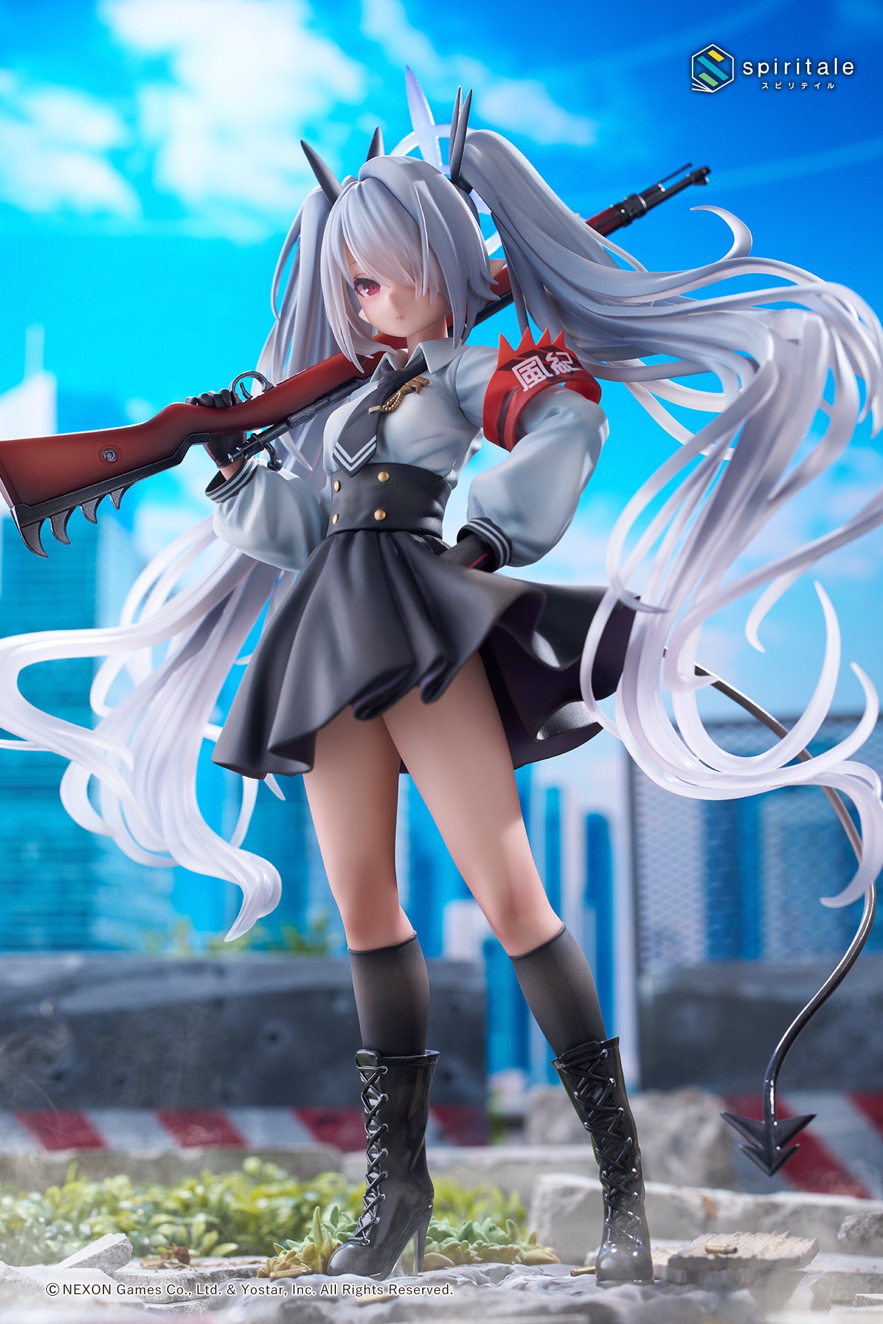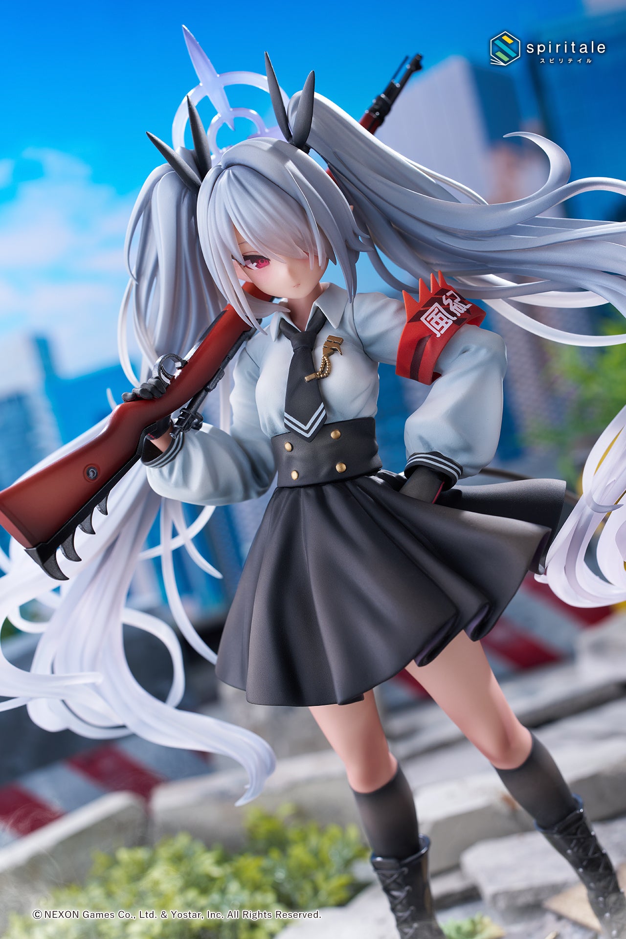 胸元に輝くブローチ、ひらひらとなびくハイウエストのミニスカート、そこからスラリと伸びた脚のハイソックス、編み上げブーツの質感。ゲームイラストでも特に印象的な紅い「風紀」の腕章も細部まで再現しています。