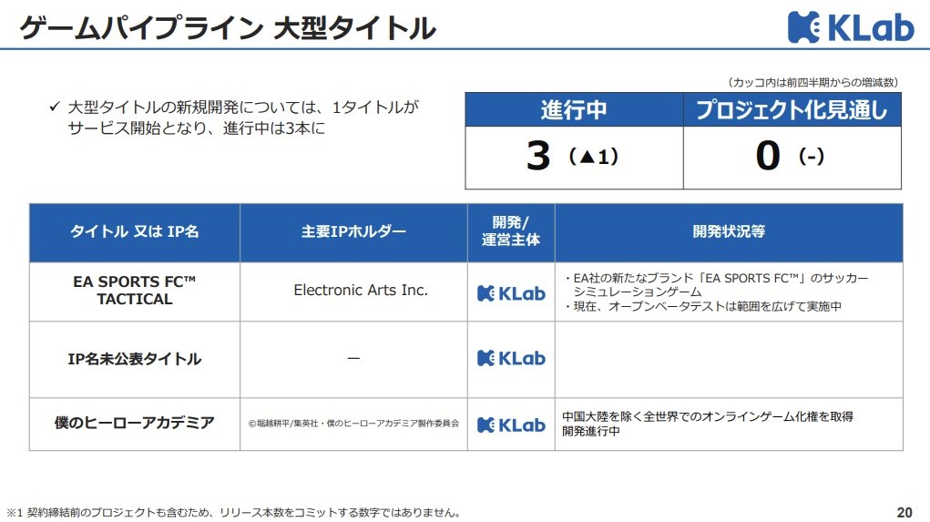 なお、Electronic Arts(EA)と共同開発中の新作サッカーゲーム『EA SPORTS FCTactical』は 全世界で事前登録を開始した。本作は、EAからも「EA SPORTS FC」ブランドの最新作としてリリース予定であることが公開されており、KLabとしても「非常に期待できるタイトル」として位置づけているとのこと。