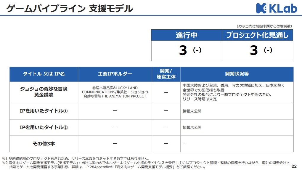 支援モデルについても前四半期と変わらず「ジョジョの奇妙な冒険 黄金讃歌」のIPを用いたタイトルなど合計3本の開発が進行中となっている。なお、プロジェクト化見通しのタイトルも前四半期と同じく3本となっている。