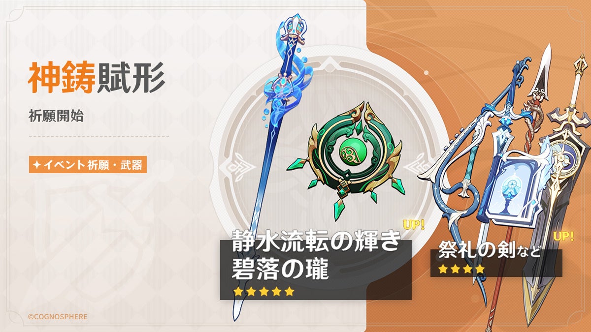 期間中、新★5武器「片手剣・静水流転の輝き」、限定★5武器「法器・碧落の瓏」などの出現率が大幅にUPします。