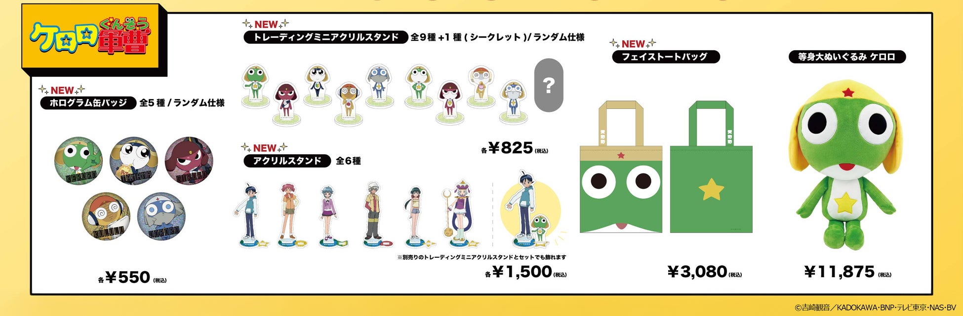 ケロロの顔が一面にプリントされた「フェイストートバッグ」や「トレーディングミニアクリルスタンド」(全9種+シークレット1種)はファン必見のラインナップとなっております。