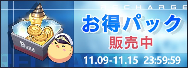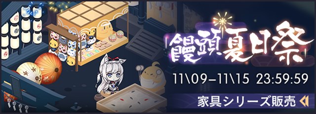 11月9日メンテナンス後より、ショップにお得パックの追加、装備外装箱(水公園)復刻販売、家具シリーズ「饅頭夏日祭」復刻販売を行っている。