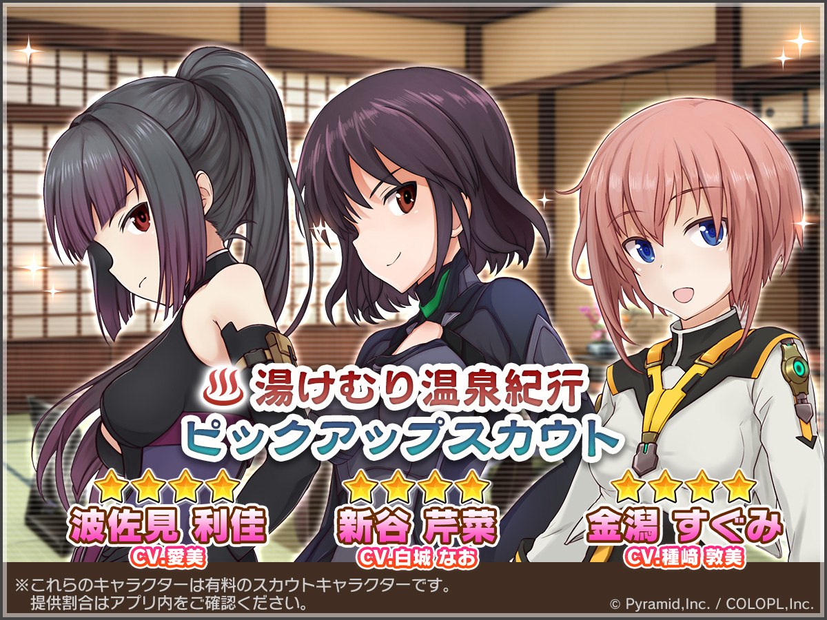 イベントに登場する「波佐見 利佳(CV:愛美)」、「新谷 芹菜(CV:白城 なお)」、「金潟 すぐみ(CV:種﨑 敦美)」のノーマル★4キャラクターをピックアップしたスカウトが開催中。