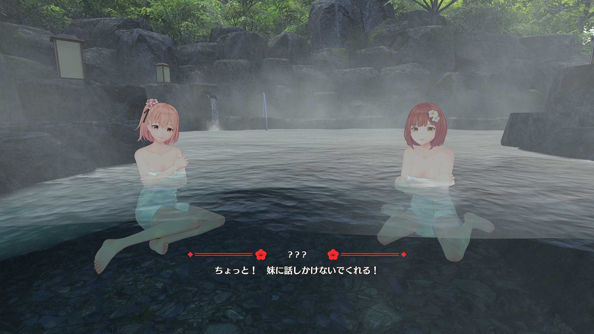 主人公は恋来いの湯の露天風呂で幼馴染の姉妹と再会します。小さかった頃の面影を残しながら、美しく成長した心梅(コウメ)と桜愛(サクラ)との関係を、ヒロインとの会話やスキンシップを通じて深めていきます。果たして、どちらのヒロインと恋の花を咲かせるのか、それとも3人で…。 主人公になりきり、物語を追体験する『アドベンチャーパート』と、温泉ならではのストーリー展開が楽しめる『アクションパート』。