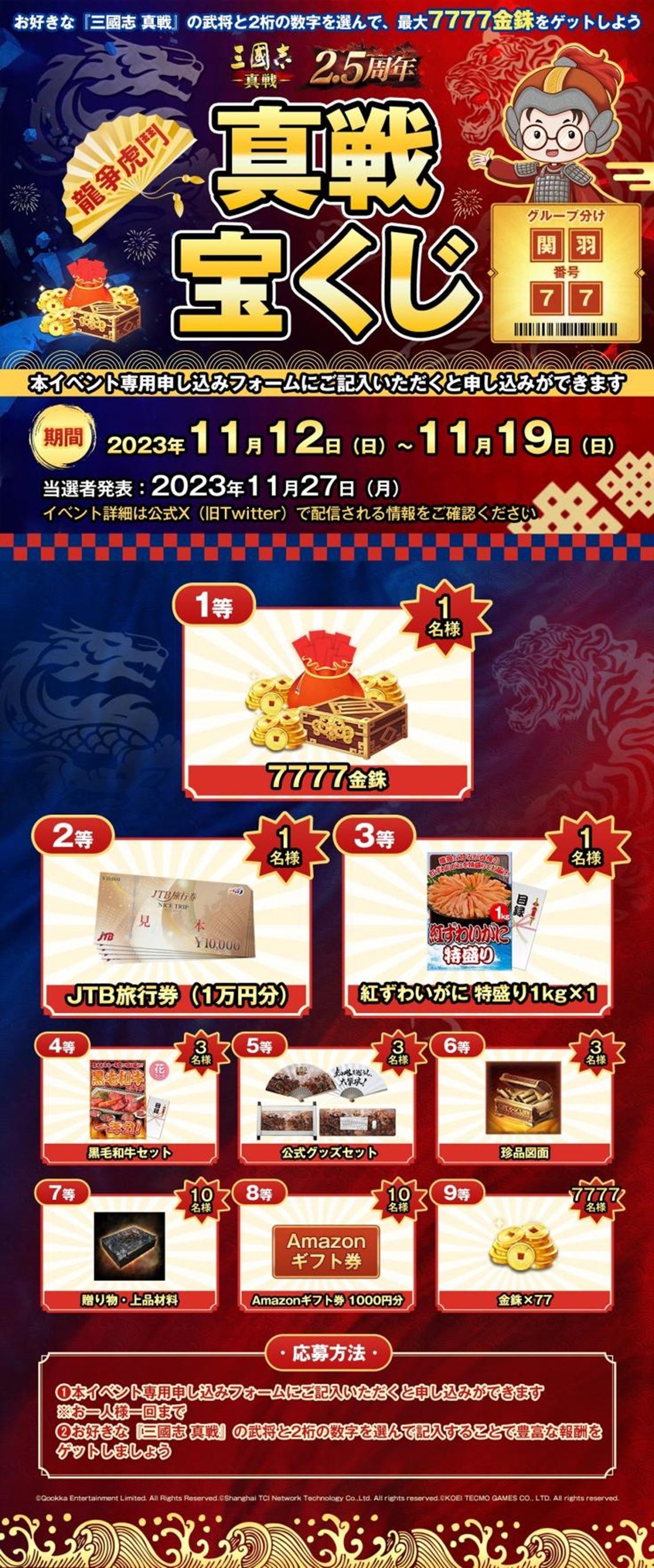 さらに、人気だった真戦宝くじの特別バージョンが「龍争虎闘」イベントと一緒にやってきました!今回の真戦宝くじは、最大7777金銖や、JTB旅行券、和牛セットなど豪華な報酬を用意しましたので、ぜひ忘れずに参加してください!