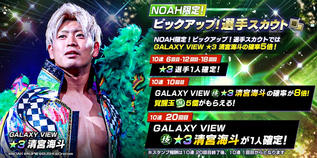 NOAH限定の★3選手、SSRパートナーが確定で獲得しやすい各有償限定ピックアップ10連スカウトを同時開催。この機会をお見逃しなく!