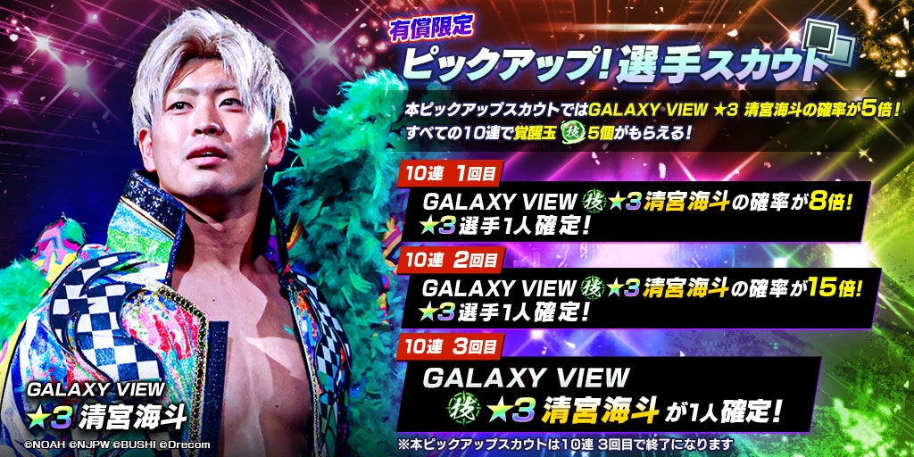 新日SSは2023年11月15日(水)メンテナンス終了後から、NOAHより新規育成選手として、★3「[GALAXY VIEW]清宮海斗」が登場する「NOAH限定!ピックアップ!選手スカウト」を開催。本スカウトは、10連スカウトを既定回数行うと、ラインナップに含まれる★3選手からいずれか1人を確定で獲得できる仕様となる。また、今回初登場する★3「[GALAXY VIEW]清宮海斗」は、ピックアップ対象として、スカウトのプレイ回数に関わらずスカウト確率が通常の5倍となっている。