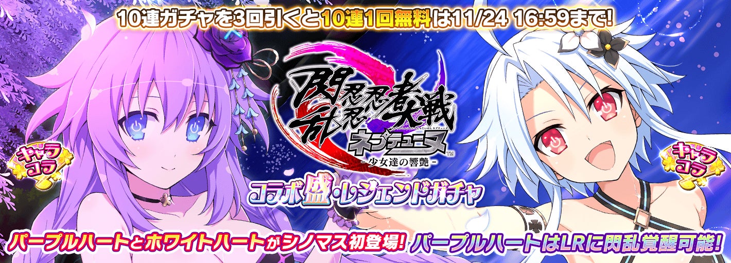 閃乱忍忍忍者大戦ネプテューヌコラボ 盛・レジェンドガチャでは、「パープルハート」と「ホワイトハート」がシノマスに初登場!