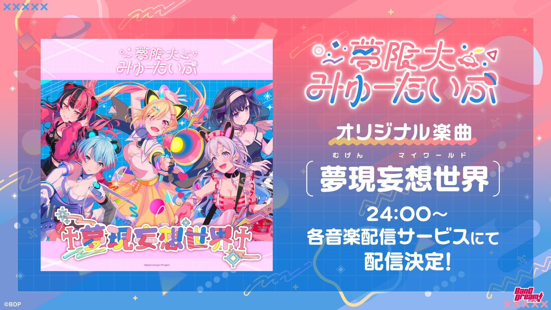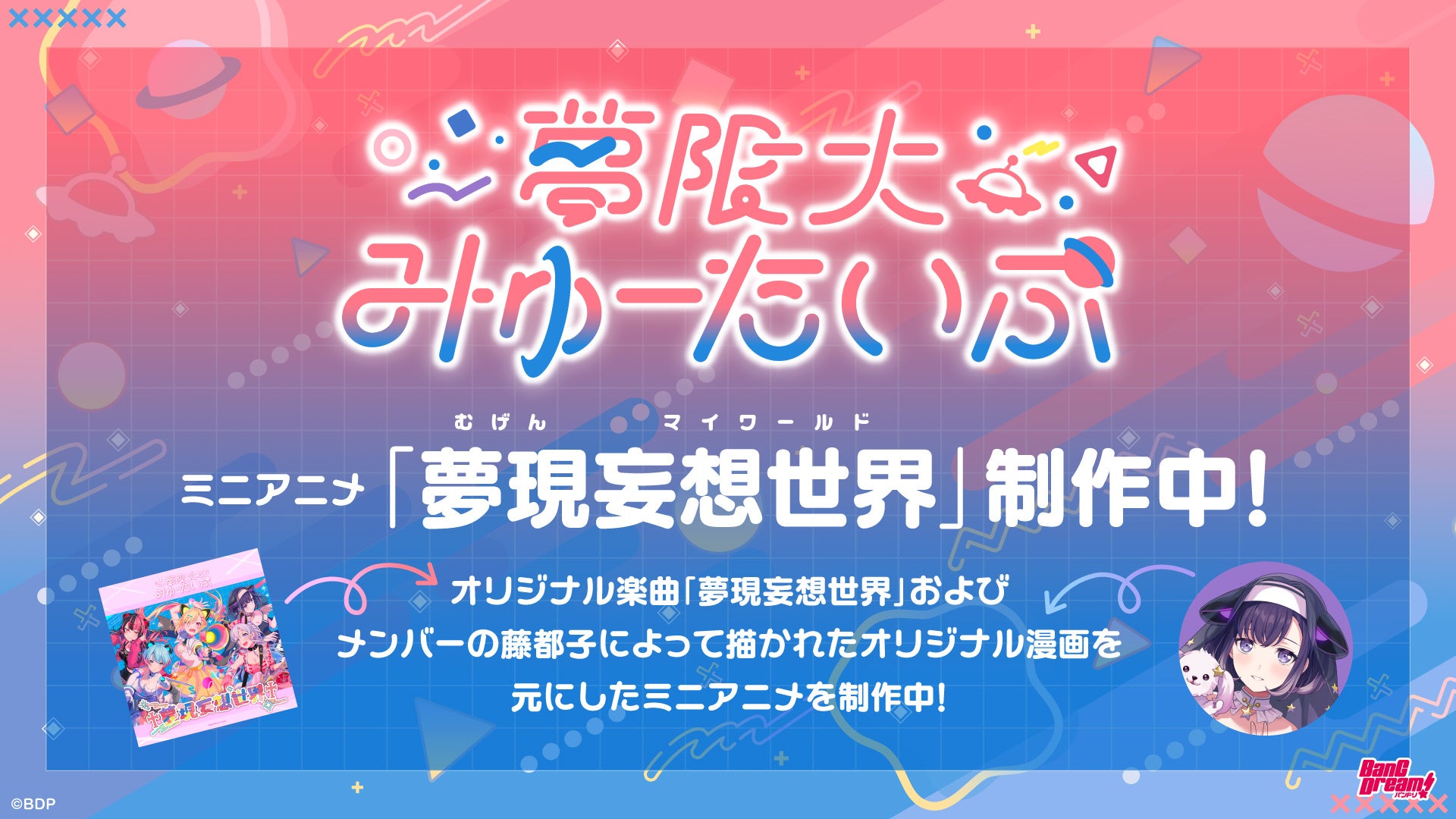 ブシロードミュージックは、バンドリ!プロジェクトの新バンド「夢限大みゅーたいぷ」より、初のオリジナル曲「夢現妄想世界」(読み:むげんマイワールド)の公開を発表した。