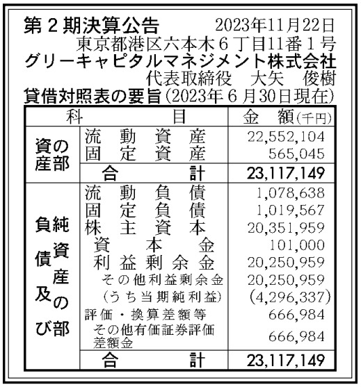 グリーキャピタルマネジメントの2023年6月期(第2期)の決算は、最終利益が42億9600万円と黒字転換を達成した。前の期(2022年6月期)の実績は、最終損失3900万円だった。11月22日付の『官報』に掲載された「決算公告」で判明した。