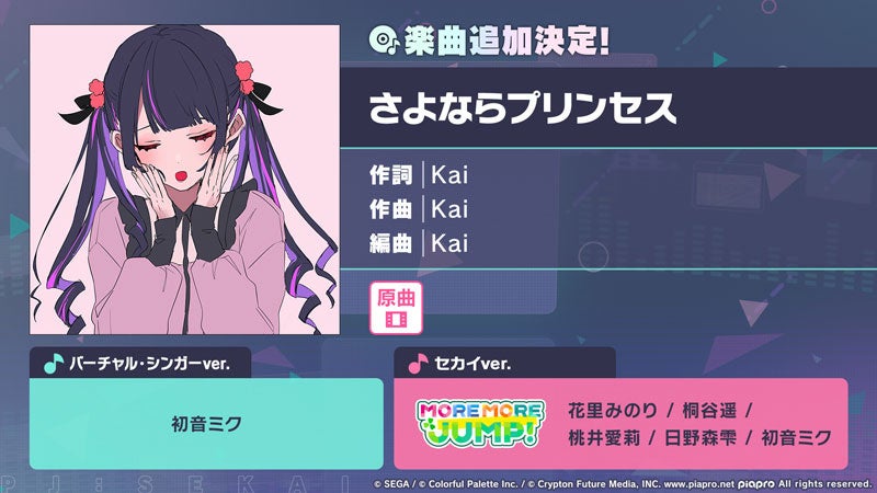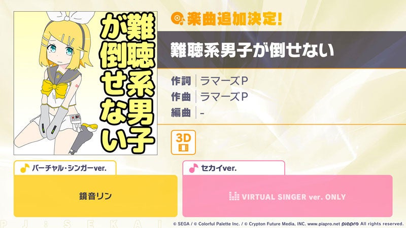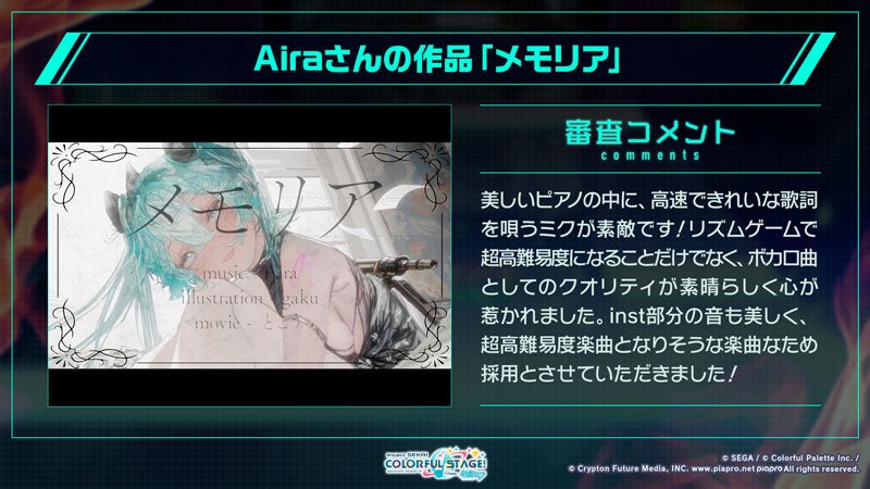 「第2回超高難易度楽曲コンテストプロセカULTIMATE」の採用作品が、「おぎゃりないざー」(作詞・作曲:Ponchi♪)、「ダイジョブですか?」(作詞・作曲:cosMo@暴走P)、「メモリア」(作詞・作曲:Aira)に決定いたしました。採用作品は今後リズムゲーム楽曲として追加予定です。