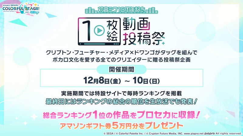 「1枚絵動画投稿祭」とは、1枚絵を使ったMVで楽曲をニコニコ動画に投稿するお祭り企画となります。「1枚絵動画投稿祭」に投稿された作品から総合1位になった楽曲は、『プロジェクトセカイ』にリズムゲーム楽曲として追加され、Amazonギフトコード50,000円分がプレゼントされます。