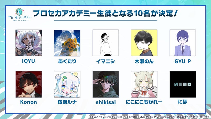 ボーカロイド文化の未来を担う若手クリエイターの育成・創出を目指した番組参加型企画、「プロセカアカデミー」のオーディションに選ばれた10名が発表されました。選ばれた10名の方々には全2回の番組を経て、1人1曲ボカロ楽曲を制作していただきます。制作された楽曲は、2024年1月上旬頃にYouTubeとニコニコ動画で公開予定です。また、皆様の投票によって選ばれた1曲は、今後ゲーム内にセカイver.として実装される予定です。詳細はプロセカアカデミー特設サイト( https://pjsekai.sega.jp/academy/index.html )よりご確認ください。