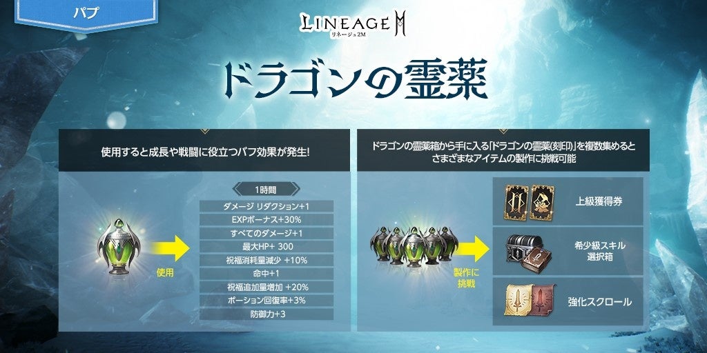 「ドラゴンの霊薬」は、使用することで「ダメージ リダクション」や「EXPボーナス」を一定時間向上できるほか、製作の材料として使用できる新アイテムです。「ドラゴンの霊薬」を使用して製作できるアイテムは週ごとに異なります。