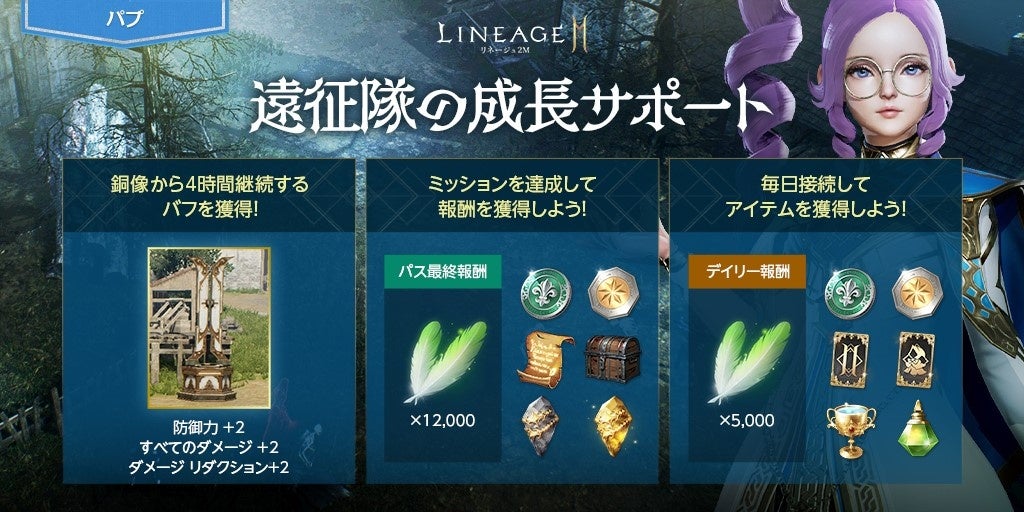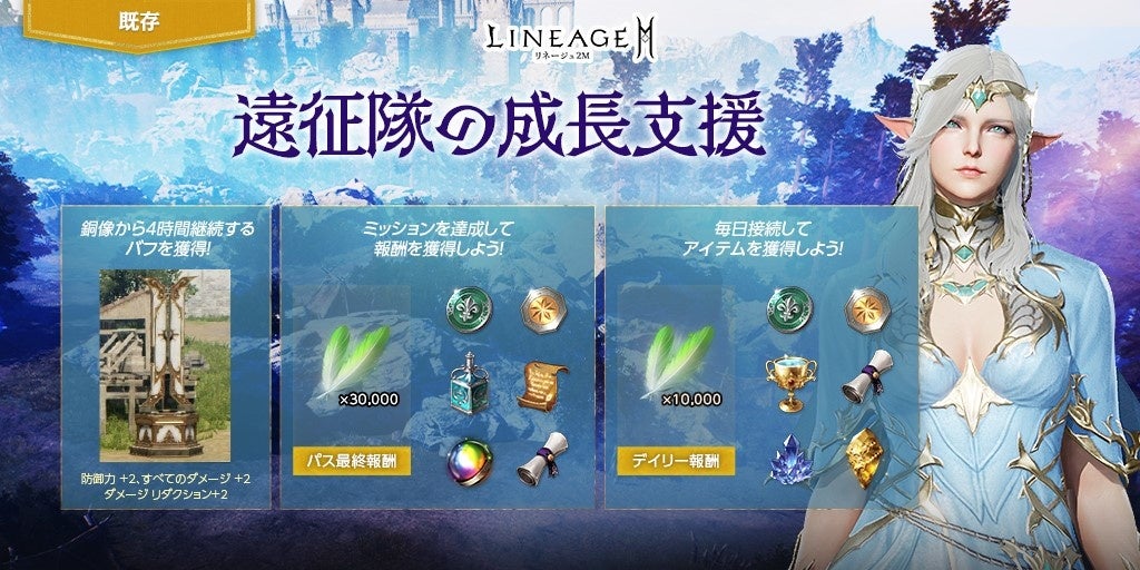 期間中、毎日達成していくデイリー ミッションと2週間でクリアを目指すシーズン ミッションで構成された、新規シーズンパス「遠征隊のシーズンパス」が登場します。デイリー ミッション、シーズン ミッションをそれぞれ達成してシーズンパスEXPを獲得し、パス レベルを上昇させることで、「ダンジョン時間補充石選択箱(イベント)」や「祝福された生命の石(イベント)」、「祝福された精霊の石(イベント)」など、様々なアイテムを報酬として獲得することができます。さらに、1,000,000アデナを使用することでプレミアム報酬を有効化することができます。最終報酬として、「アインハザードの祝福」12,000を獲得することが可能です。