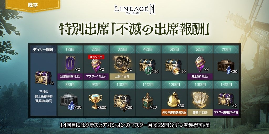 毎回もらえる「不滅の最上級獲得券選択箱(刻印)」2個のほか、「不滅の伝説級クラス挑戦券(1回)(刻印)」や「不滅のマスター獲得券2in1箱(刻印)」「不滅の豪華なアーティファクト獲得券(11回)(刻印)」などのアイテムを受け取ることができます。