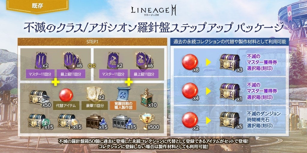 「不滅の羅針盤箱(刻印)」50個に、クラスまたはアガシオンのマスター召喚22回分と最上級召喚66回分、「上級覚醒のポーション(刻印)」10個、「不滅の記憶コレクションの証(刻印)」などがセットになった「不滅のクラス/アガシオン羅針盤ステップアップ パッケージ」が登場しました。