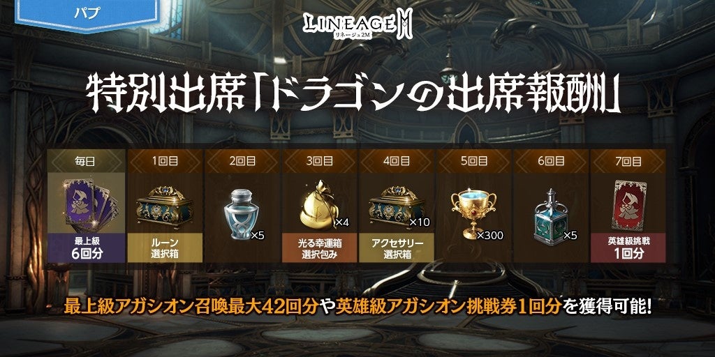 毎回もらえる「ドラゴンの最上級アガシオン獲得券(6回)(刻印)」1個のほか、「光るルーン選択箱(刻印)」1個や「ドラゴンの英雄級アガシオン挑戦券(1回)(刻印)」などのアイテムを受け取ることができます。