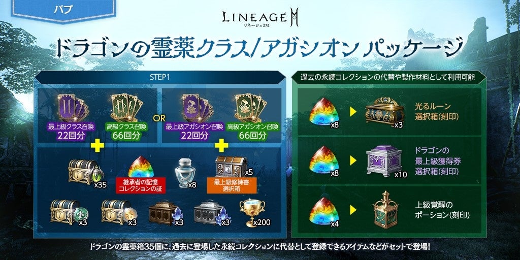 「ドラゴンの霊薬箱(刻印)」35個に、クラスまたはアガシオン最上級召喚22回分と、高級召喚66回分に、「ピュアエリクサー(刻印)」8個、「継承者の記憶コレクションの証(刻印)」1個などがセットになった「ドラゴンの霊薬クラス/アガシオン パッケージ」が登場しました。