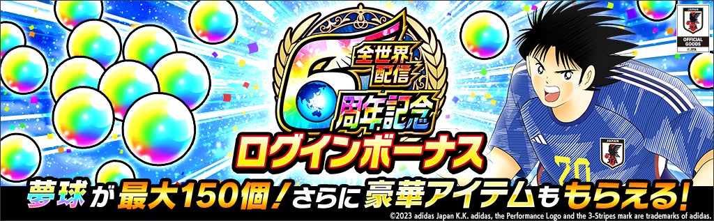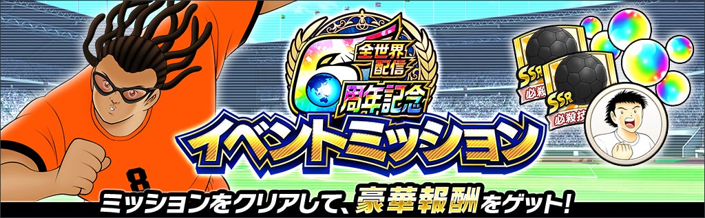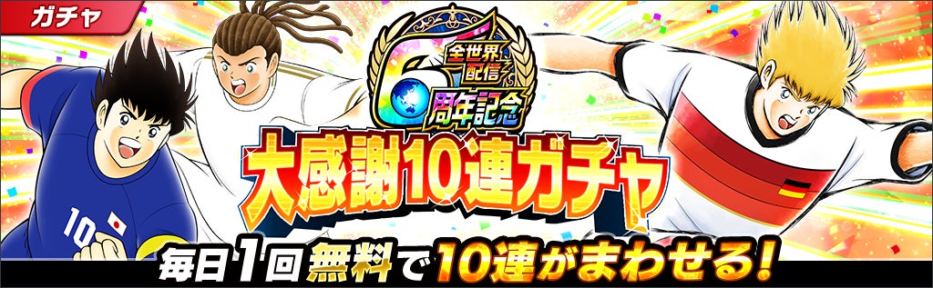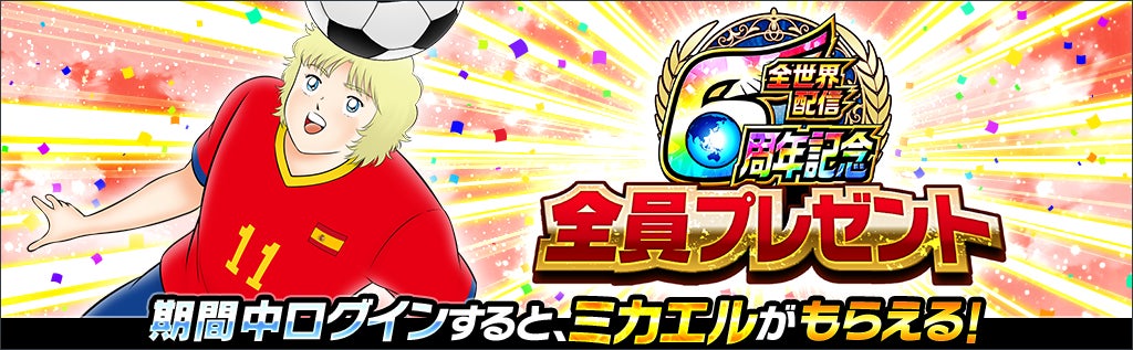 KLab<3656>は、『キャプテン翼 ~たたかえドリームチーム~』で、全世界配信6周年を記念して12月1日(金)より「全世界配信6周年記念キャンペーン」を開催する。「全世界配信6周年記念 選べるSSR確定ガチャチケット」など豪華プレゼントがもらえる。