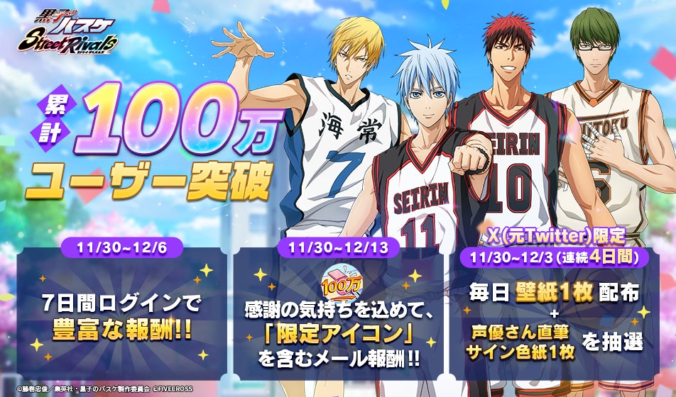 ファイブクロスは、アニメ『黒子のバスケ』の3Dバスケゲーム『黒子のバスケ Street Rivals』(黒バスSR)において、100万ユーザーを突破したことを発表した。