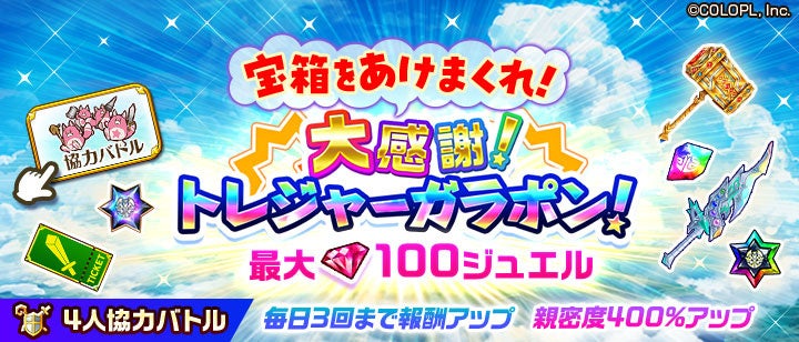 2023年11月22日(水)より、日頃『白猫』を遊んでくださっている皆様に感謝を込めた年末キャンペーン「大感謝プレゼントフェスタ2023!!」が開催中です。ログインすることで、★5キャラを仲間に迎えられる「特別★5キャラガチャチケット」をプレゼントしております。また豪華報酬をゲットできる協力バトル「大感謝!トレジャーガラポン!」をお楽しみいただけます。