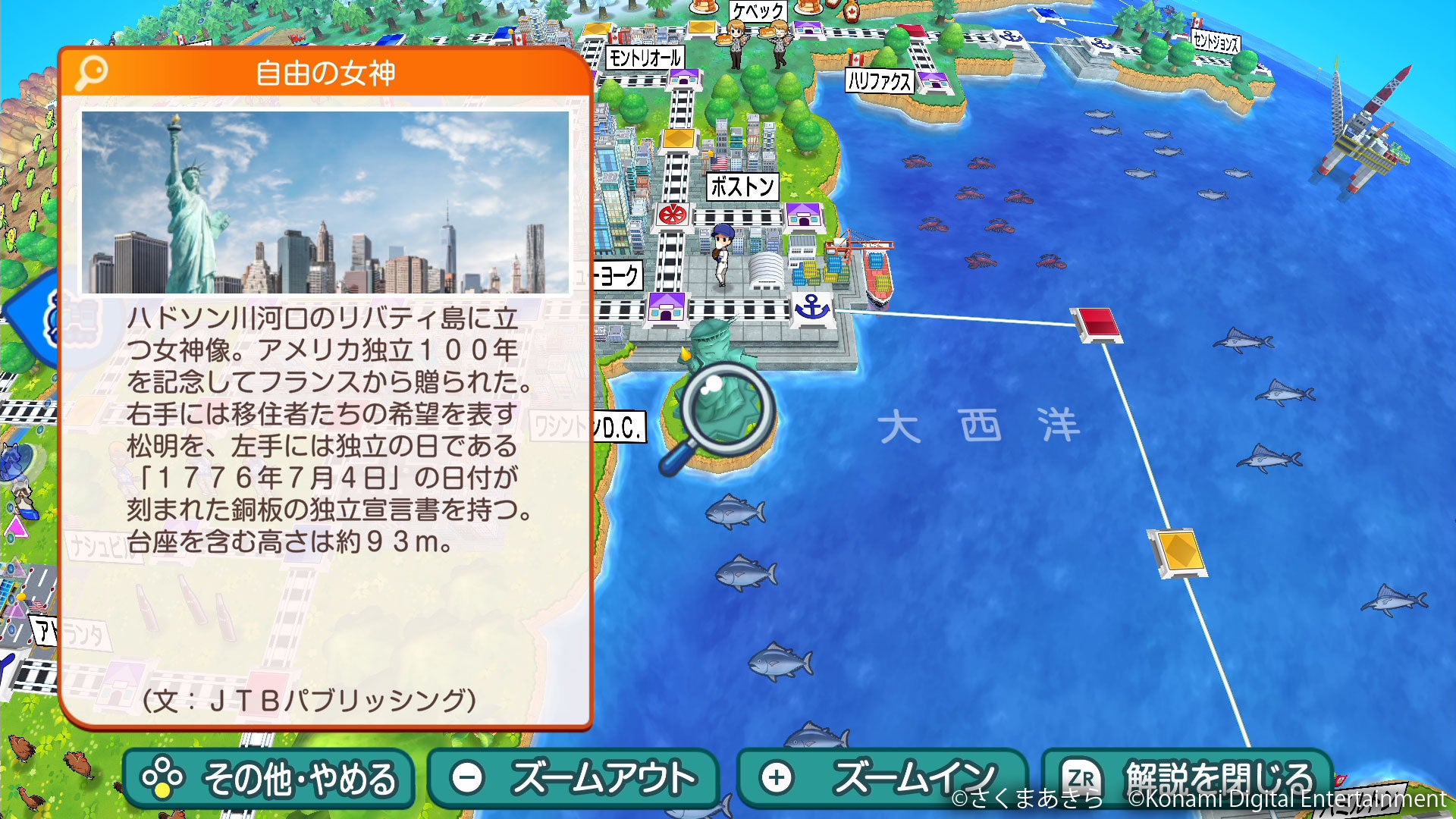 『桃鉄ワールド』を最新版へアップデートすることで、『桃太郎電鉄 ~昭和 平成 令和も定番!~』でも好評だった「虫メガネで解説」機能を楽しめる。「虫メガネで解説」機能を使うと、マップ上に表示される虫メガネで、世界各地のランドマークや物件駅の詳しい情報がチェックできる。