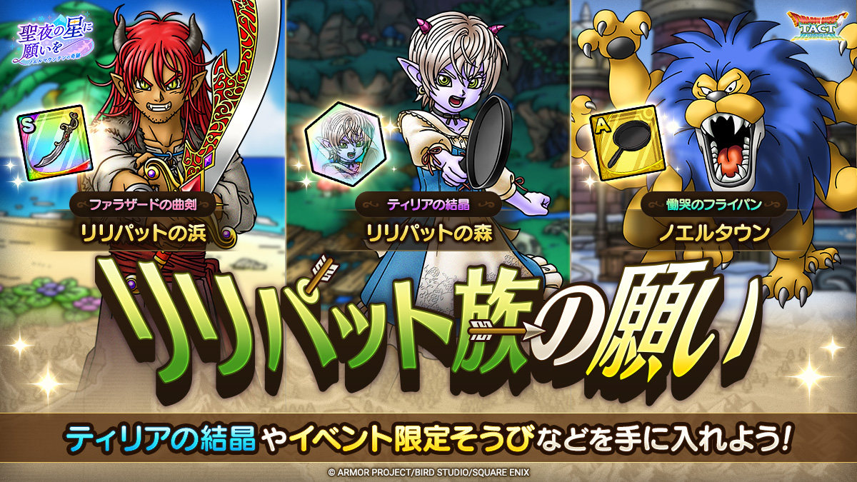 3つのクエストで構成した「リリパット族の願い」が登場する。イベントクエストでなかまにできるイベント限定???系Aランクキャラクター「ティリア」の覚醒に使用できる「ティリアの結晶」やイベント限定Sランクぶき「ファラザードの曲剣」などを手に入れたい。