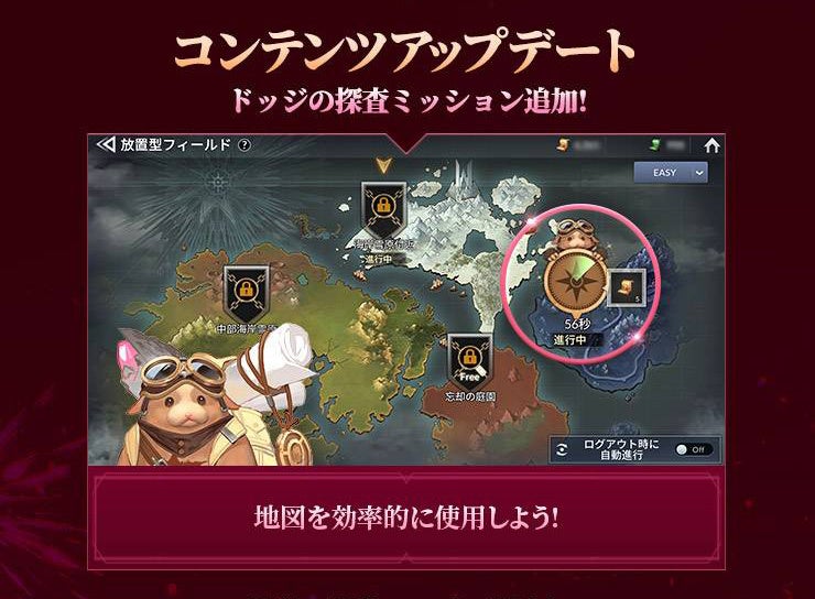 放置型フィールドに「ドッジの探査ミッション」を追加しました。プレイヤーはオンライン状態で地図を使用し、実施回数を指定して探査を行います。探査が終了すると実施回数に応じた報酬を獲得することができます。ただし、既存の放置型フィールドと同時進行することはできません。