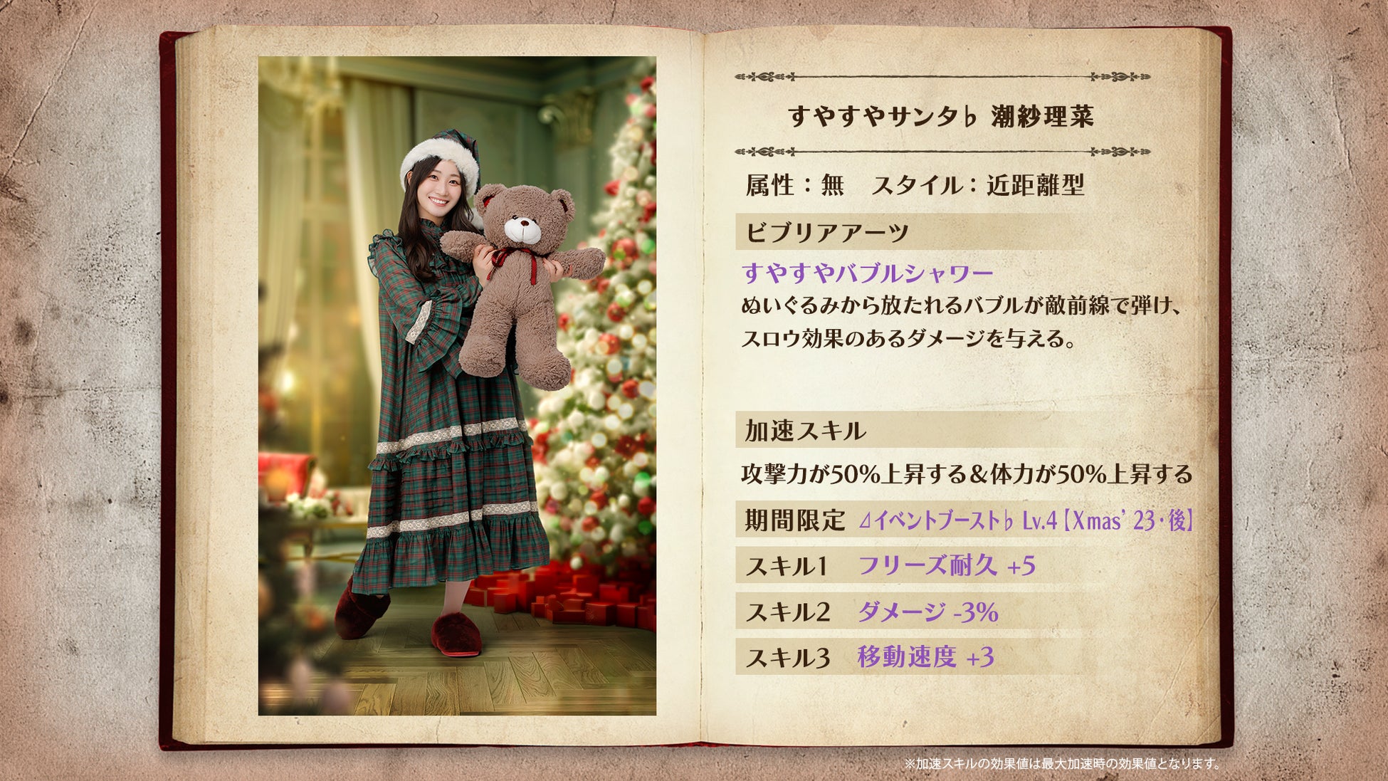 パーティ内の「★4 クリスマス2023」ユニットを強化する期間限定スキルを所持!累計ポイント報酬などで入手することができる。