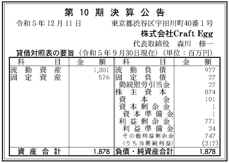 サイバーエージェント<4751>グループのCraft Eggの2023年9月期(第10期)の決算は、最終利益3億1700万円と黒字転換に成功した。前の期(2022年9月期)の実績は、最終損失が4億3500万円だった。本日12月11日付の「官報」に掲載された「決算公告」で判明した。