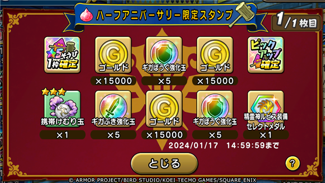 ハーフアニバーサリー期間限定で、「ハーフアニバーサリー限定 精霊神ルビス装備10連ふくびき」が開催中!「ハーフアニバーサリー限定 精霊神ルビス装備10連ふくびき」では、有償ジェム、無償ジェムどちらを使ってもふくびきを引くことができる。さらに「ハーフアニバーサリー限定 精霊神ルビス装備10連ふくびき」1回につき「ハーフアニバーサリー限定スタンプ」に「ふくびきスタンプ」が1つ押され、10回目には「精霊神ルビス装備セレクトメダル」がもらえる。