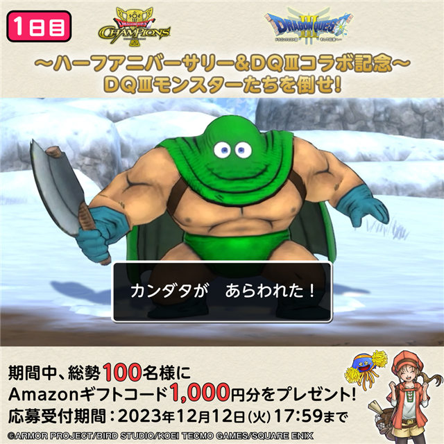 また、12月13日に『ドラゴンクエスト チャンピオンズ』がハーフアニバーサリーを迎えることを記念して期間限定のログインボーナスや、特別ミッションで豪華報酬が手に入る「ハーフアニバーサリーキャンペーン」も開催する。さらに、公式Xアカウント(@DQ_Champ)ではハーフアニバーサリー&DQIIIコラボを記念して「7日間連続開催!DQチャンプハーフアニバーサリー&ドラゴンクエストIIIコラボ記念!DQIIIモンスターを倒せキャンペーン」を開催する。