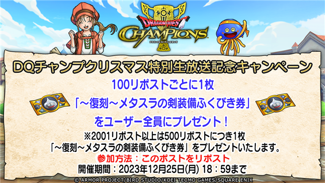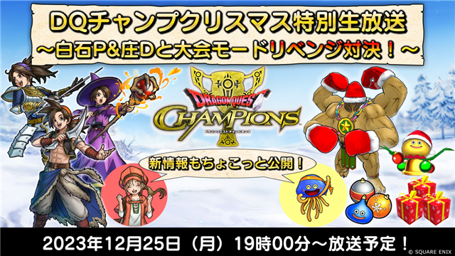 そして、12月25日19時から「DQチャンプクリスマス特別生放送~白石P&庄Dと大会モードリベンジ対決!/新情報もちょこっと公開~」をYouTubeにて生放送することが決定した。また生放送を記念して公式Xアカウントにて、「DQチャンプクリスマス特別生放送記念キャンペーン」も開始した。