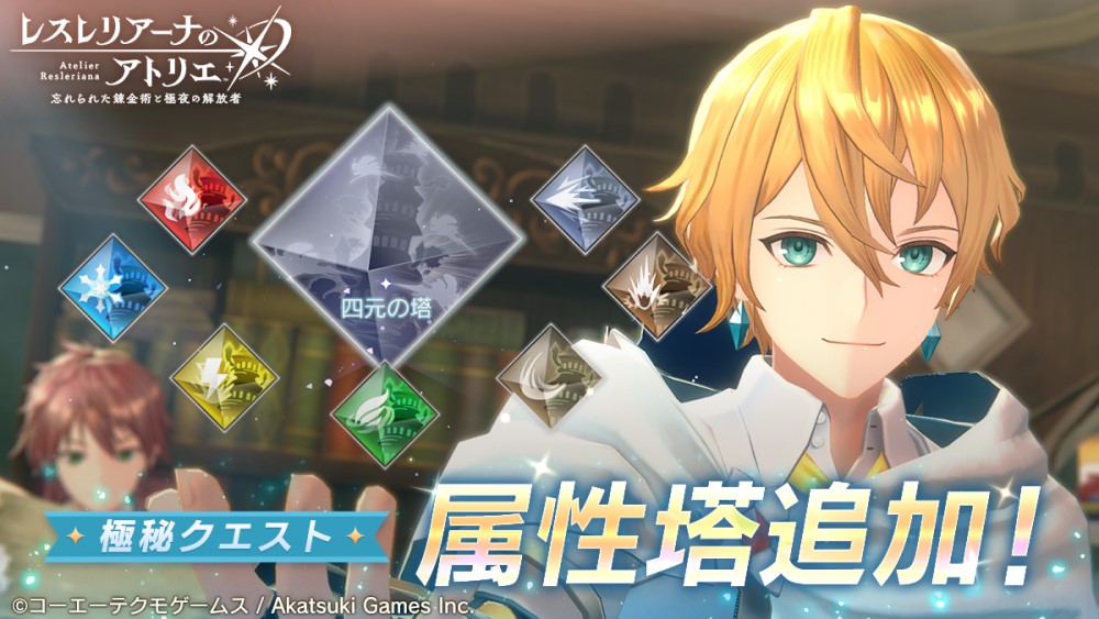 ○概 要: 「極秘クエスト」に、各得意属性のキャラクターが活躍しやすい高難度コンテンツ「属性塔」を追加しました。各階層の初回クリア時に星導石、聖玉などを獲得できるうえ、「属性塔」のクリアで「属性塔」の限定レシピを発想できます。「属性塔」はスタミナを消費せず挑戦できますので、ぜひ挑戦ください。詳細はゲーム内お知らせをご覧ください。