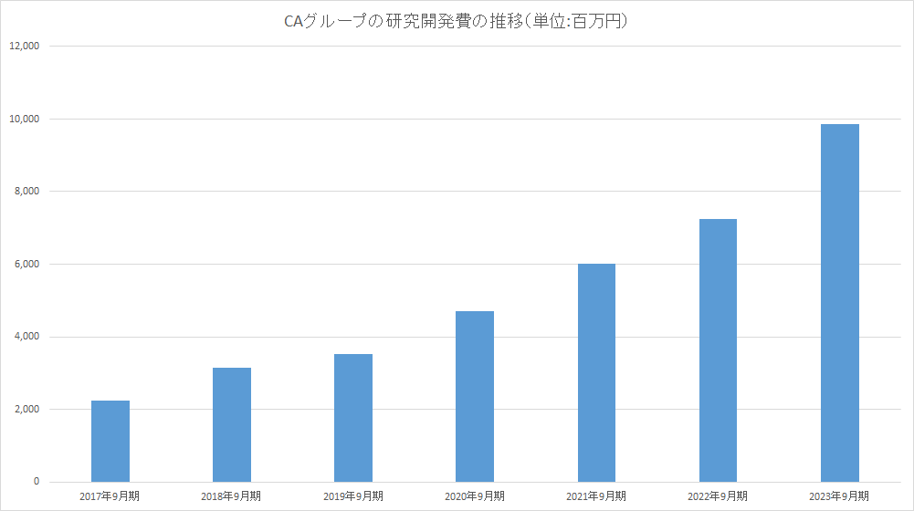サイバーエージェント<4751>は、2023年9月期の研究開発費について、前の期比36.0%増の98億5300万円だったことを明らかにした。過去最高となる。