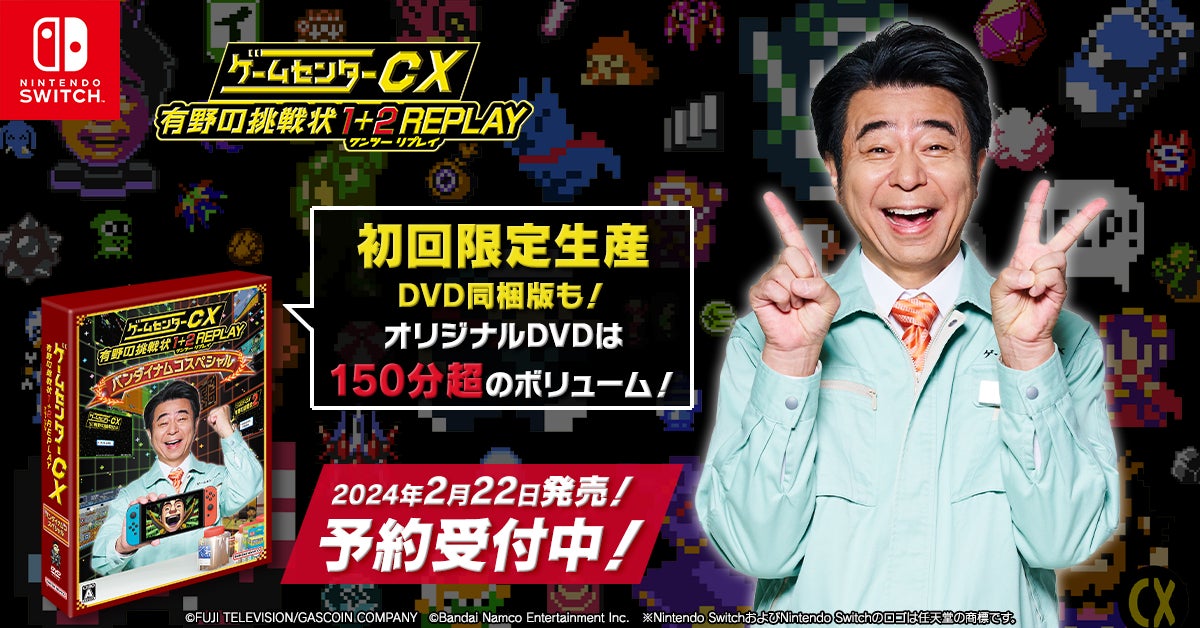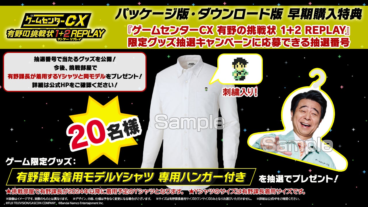 バンダイナムコエンターテインメントは、2024年2月22日(木)発売予定の Nintendo Switch用ソフト『 ゲームセンターCX 有野の挑戦状 1+2 REPLAY(ワンツー リプレイ) 』の早期購入特典の抽選番号で応募できる『限定グッズ抽選キャンペーン』のグッズ詳細を発表した。