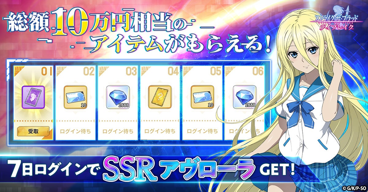 ゲーム開始から7日間、ゲームにログインするだけで総額10万円相当の多様なアイテムを獲得できるイベントを開催します。さらに、7日間ログインすると「SSR アヴローラ」がもらえます!