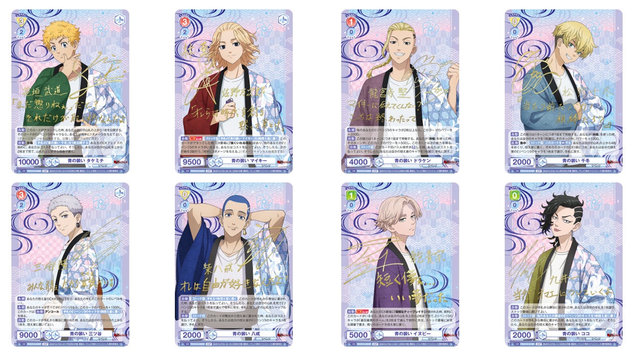 タケミチ、マイキーをはじめとした8人の描き下ろしイラストを収録!さらに、SSPのカードには豪華箔押し仕様のキャストサイン入り!