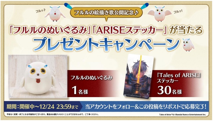 テイルズチャンネル+公式X(旧Twitter)アカウントにて、「フルルのぬいぐるみ」か「Tales of ARISE ステッカー」が抽選で当たるプレゼントキャンペーンを実施中!