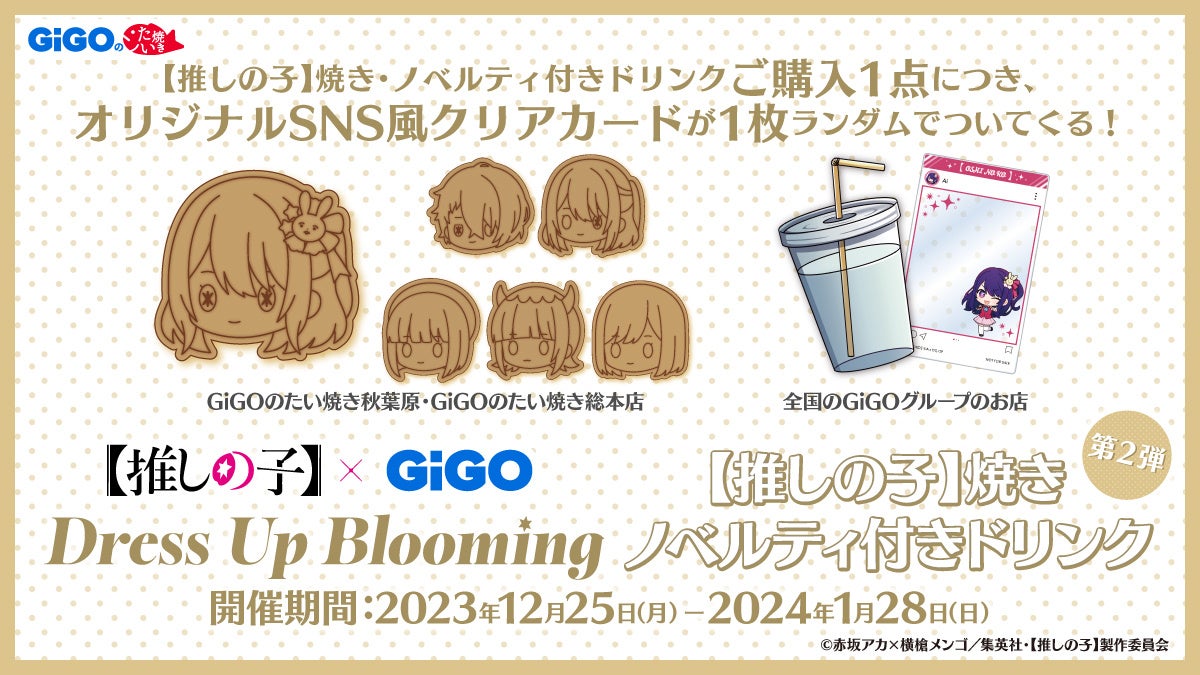 対象のGiGOグループのお店にて『【推しの子】Dress Up Blooming プライズキャンペーン 第2弾』の開催が決定!新規プライズ景品の登場に加えて【推しの子】焼き&ノベルティ付きドリンクの販売を行う。